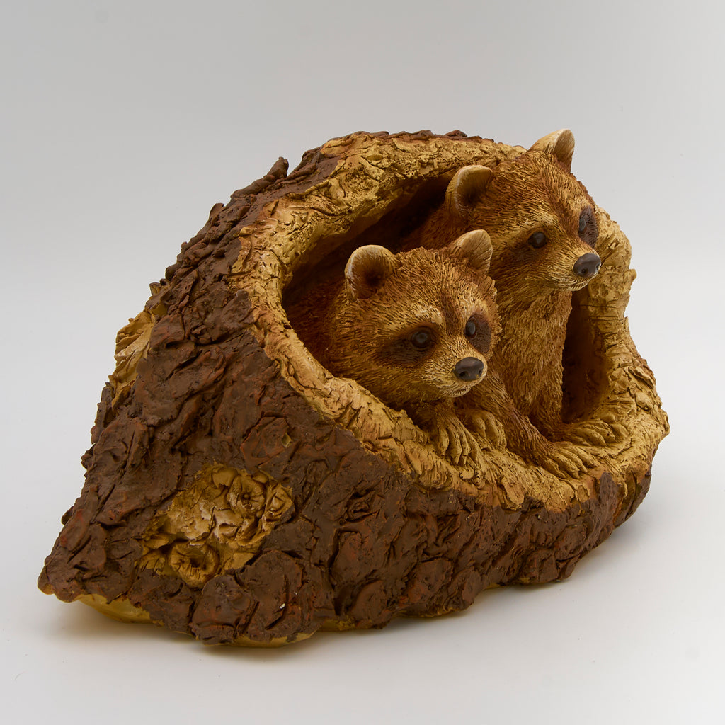 Bring playful woodland charm to your outdoor décor with the Raccoons in Tree Trunk Garden Statue from the Timber Tails Collection. Featuring two curious raccoons peeking out of a hollowed log, this piece is crafted with lifelike detail and finished in a rustic woodtone for natural appeal. Durable and weather-safe, it makes a delightful accent for gardens, patios, or woodland-inspired spaces.