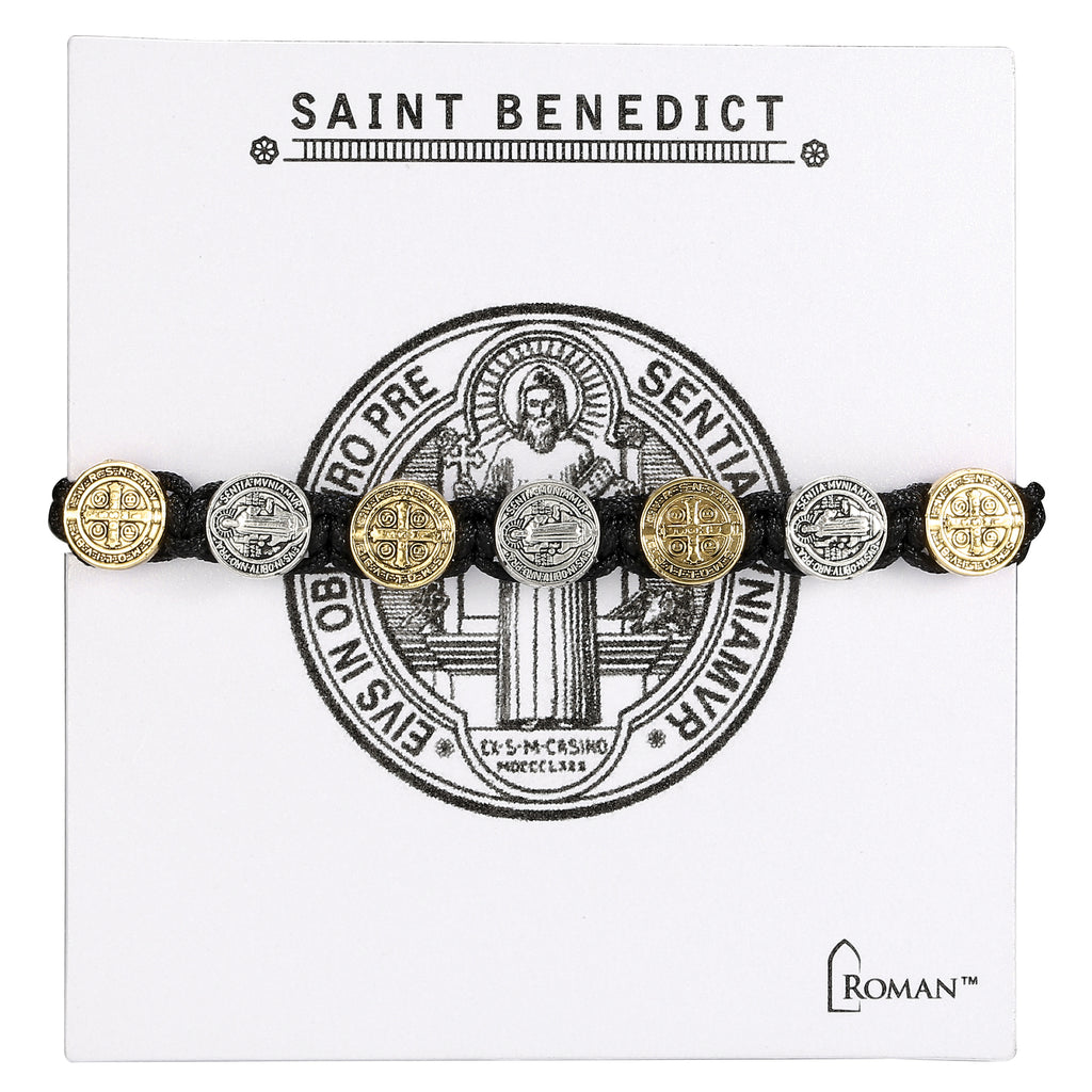 This St. Benedict bracelet blends devotional meaning with versatile style. Alternating silver and gold-tone round medals are woven into a durable black braided cord, each displaying the detailed Benedictine cross and inscriptions on both sides. Lightweight and comfortable, it serves as a daily reminder of faith and protection. Presented on a card, it makes a thoughtful and gift-ready expression of encouragement and devotion.