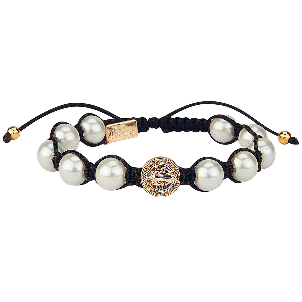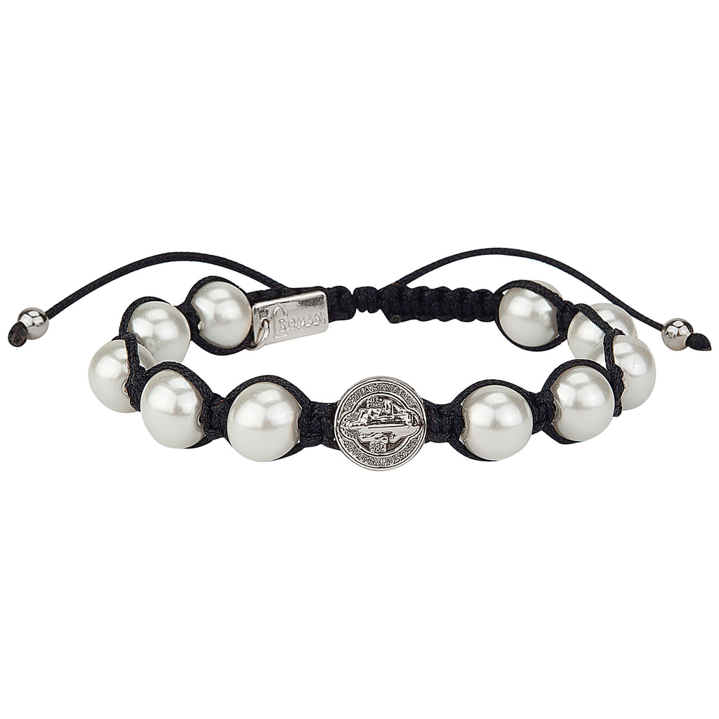 A blend of faith and elegance, this bracelet features luminous faux pearls hand-knotted on a durable black cord with an adjustable pull-tie for a perfect fit. At its center rests the St. Benedict Medal charm, a timeless symbol of divine protection and devotion. Ideal for gifting or wearing as a daily reminder of faith.