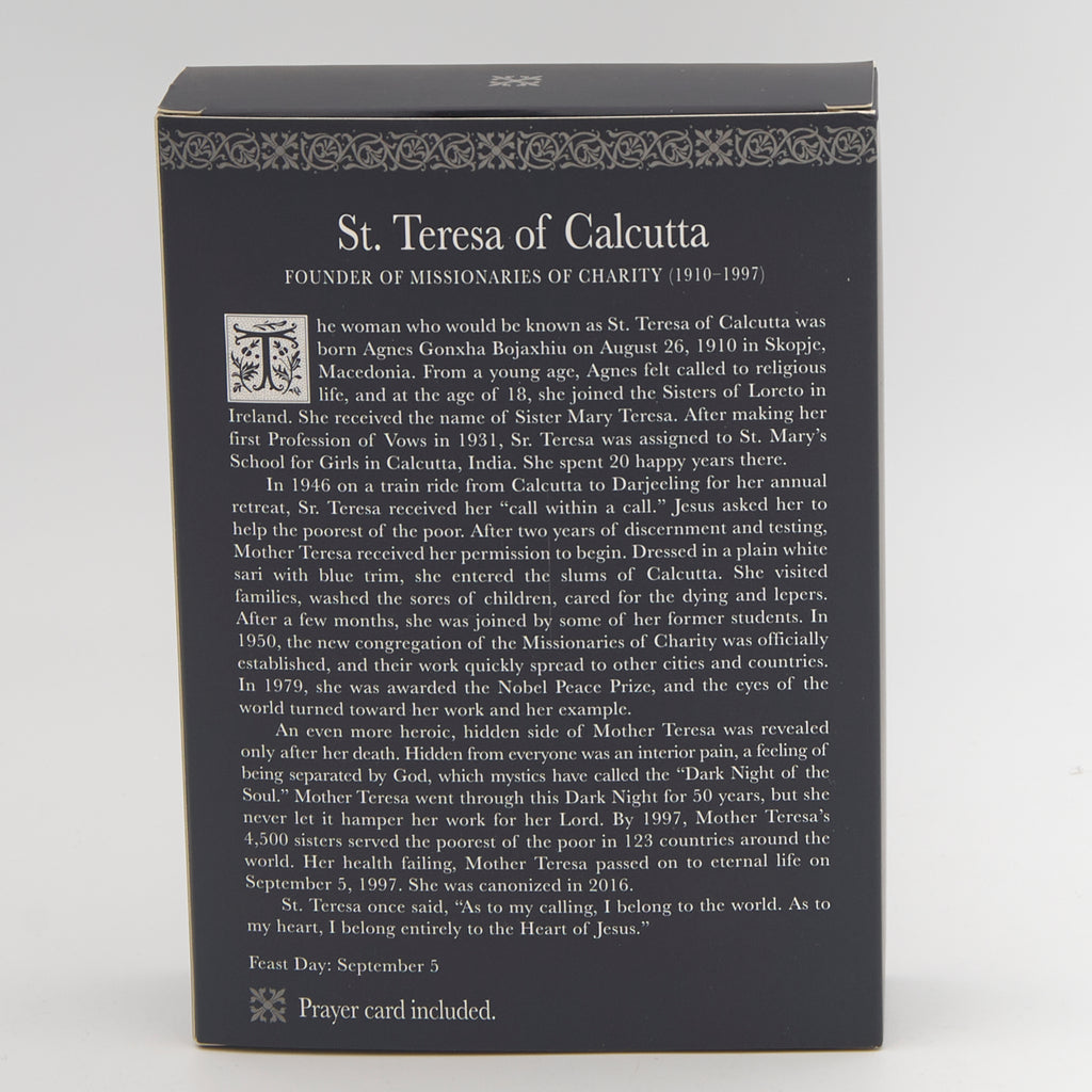 This beautifully detailed Mother Teresa figure from the Patrons & Protectors collection pays tribute to the saint’s extraordinary love and tireless service to the poor, sick, and forgotten. Depicted in her iconic white sari with blue trim, hands folded in prayer, she is a symbol of humility, compassion, and unwavering faith. Perfect for personal devotion, prayer corners, or as a meaningful gift.