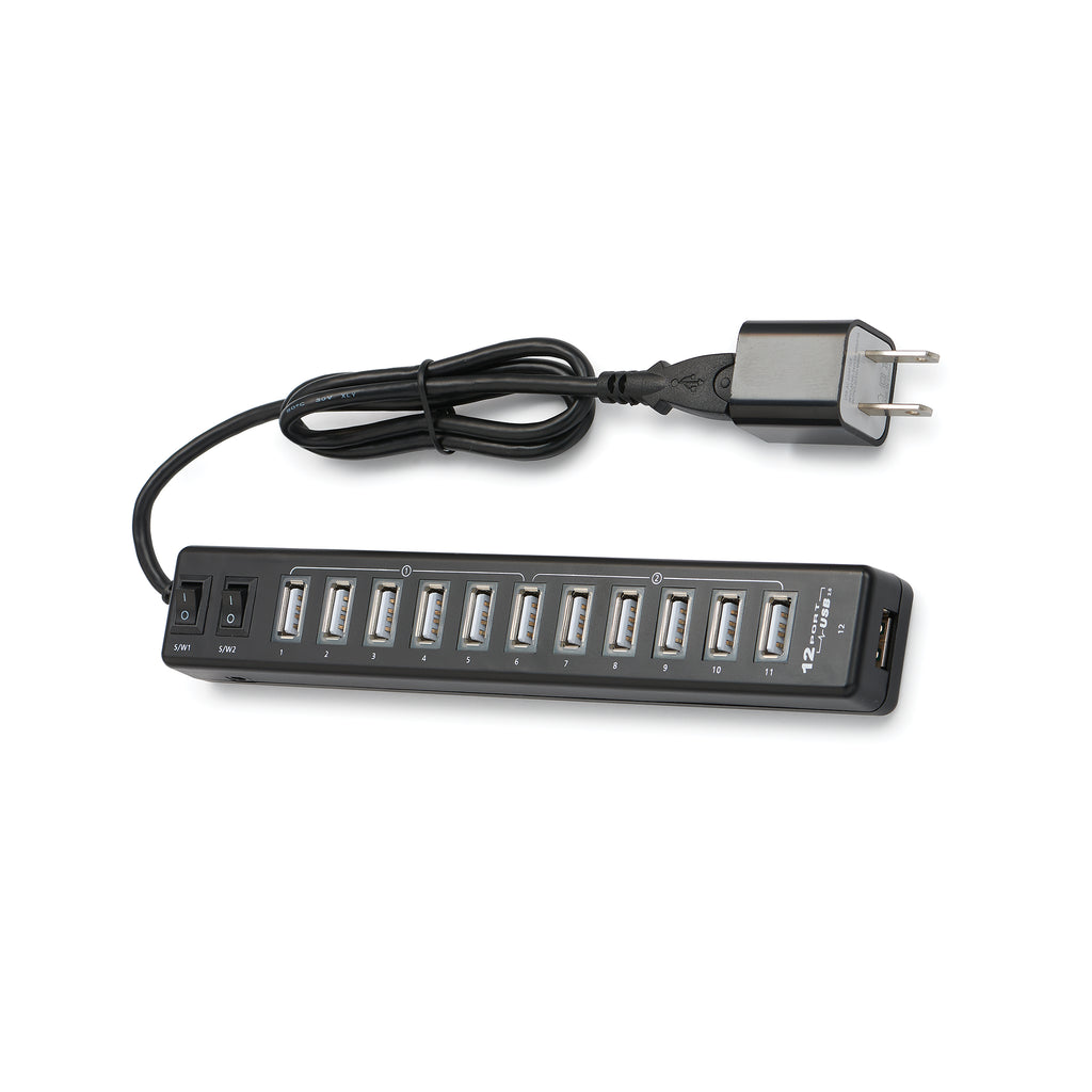 Stay powered up and organized with this 12-port USB hub. Its slim profile saves space while delivering reliable charging for all your devices. Includes adapter plug for easy setup. Perfect for home, office, or travel.