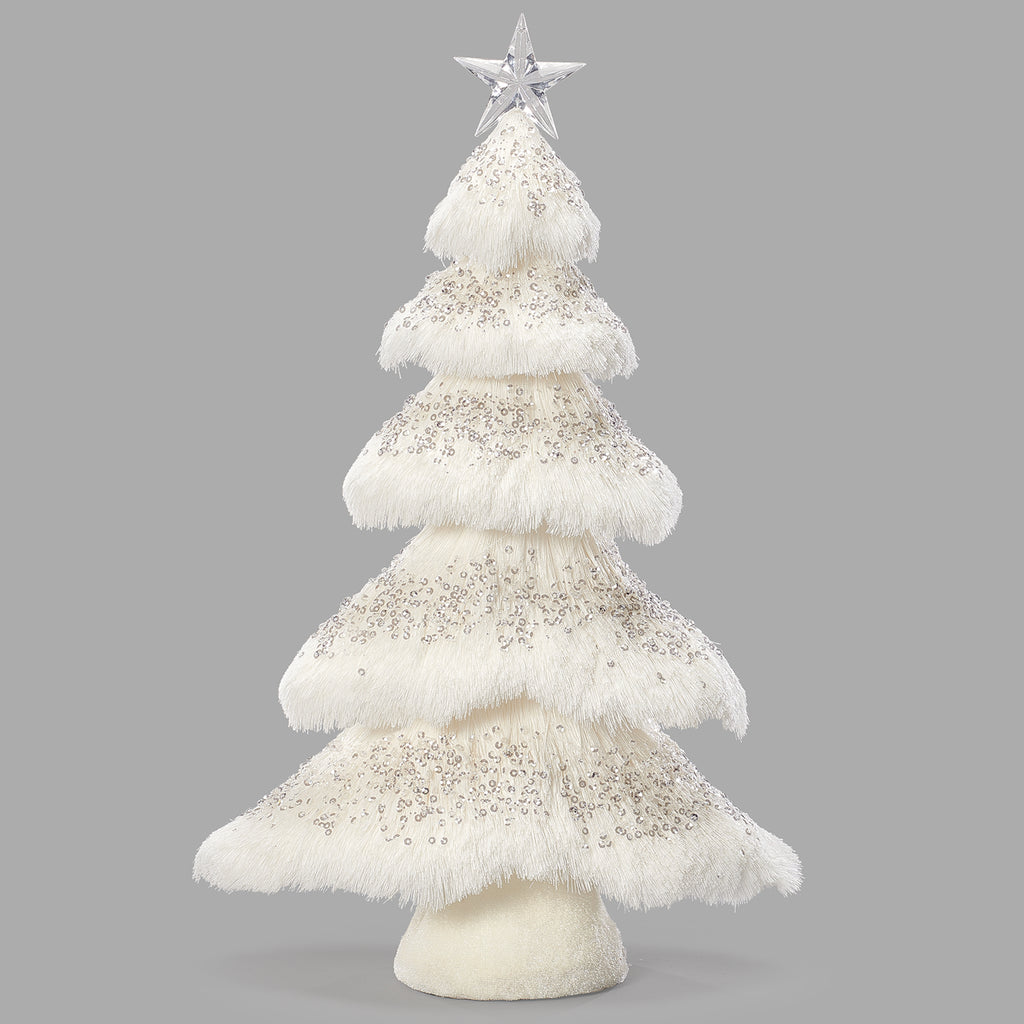 Bring modern elegance to your holiday decor with this white glitter fur tree. Covered in soft polyester with shimmering silver sequins and finished with a star topper, it's perfect for snowy vignettes and tabletop displays. Includes a paper base for effortless placement.