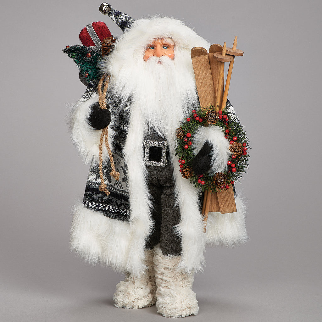 Bring wintry elegance to your holiday décor with this Santa figure. Outfitted in a soft knit coat of white and grey with plush faux fur trim, Santa carries a pair of skis, a festive wreath, and a sack of gifts. With rustic details and cozy textures, he’s the perfect addition to tabletops, hearths, or woodland-inspired displays.